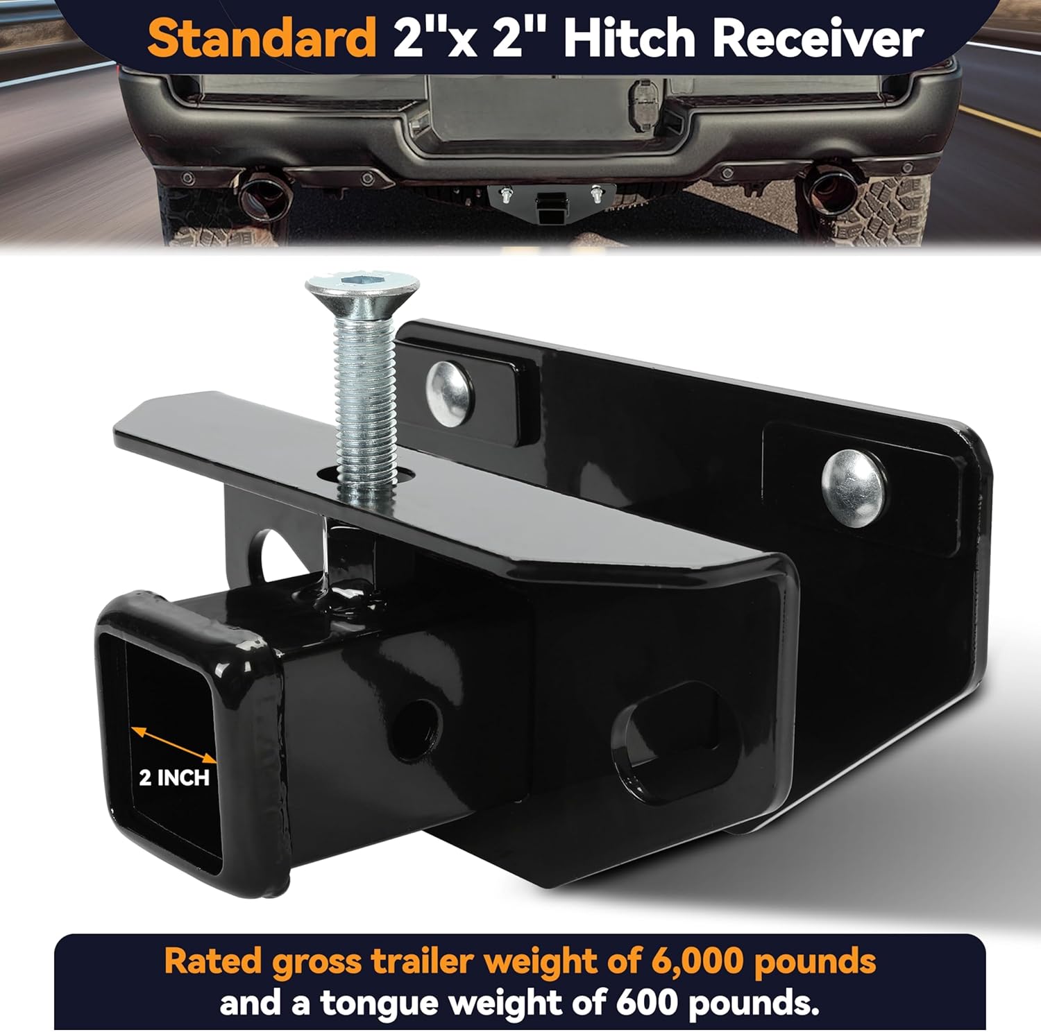 - hitch receiver is equipped to give you a variety of towing options, such as a ball mount, tow hook, etc.The 2-inch receiver is capable of supporting a rated gross trailer weight of 6,000 pounds and a tongue weight of 600 pounds.