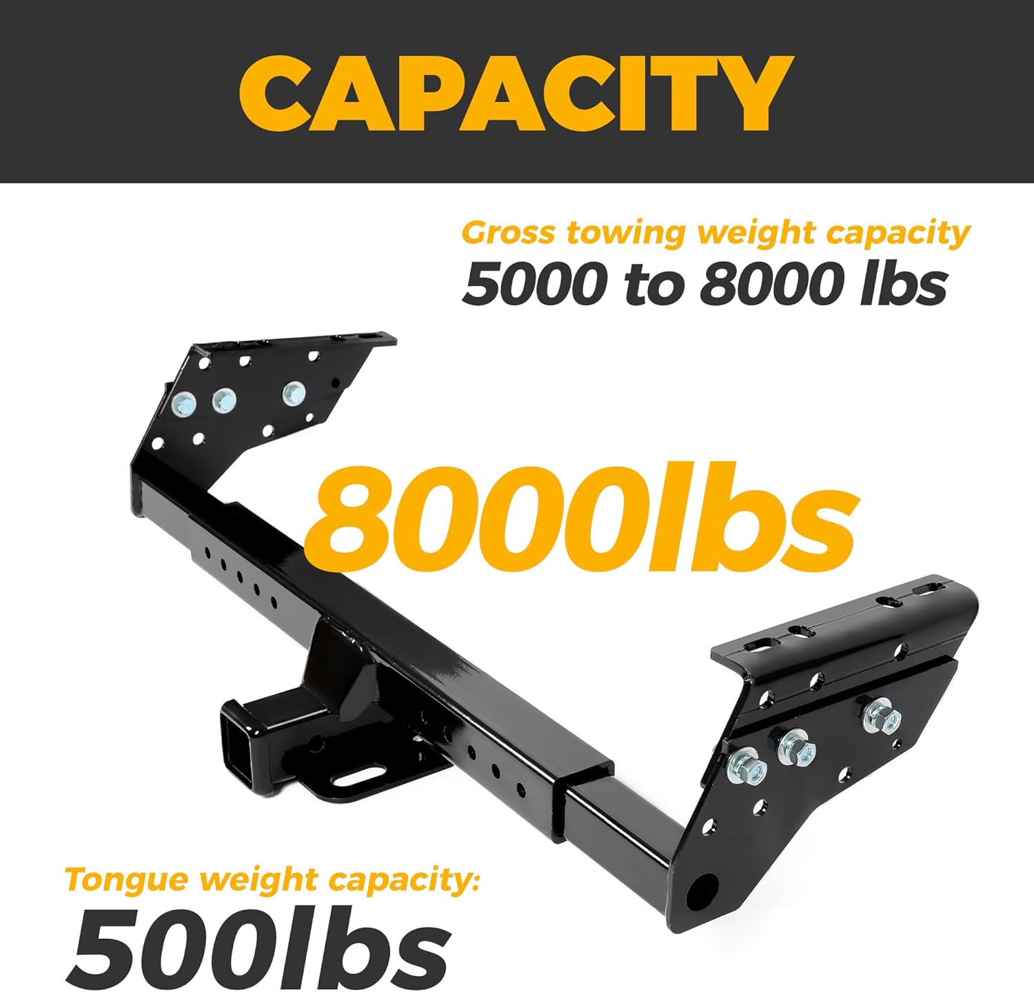 Specification: Gross towing weight capacity: 5,000 to 8,000 lbs. Tongue weight capacity: 500 lbs. Receiver tube size: 2. Product dimensions: 7 x 11 x 30 inches. Folding: No.